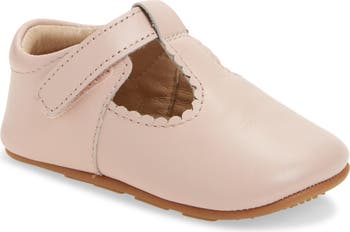 A flexible non-slip sole keeps wobbly walkers stable in this soft leather T-strap shoe secured with an adjustable strap.