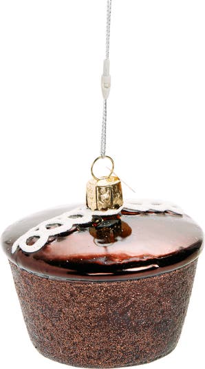 Hand-painted details give a homey vibe to this hand-blown glass ornament that looks like a supertasty Hostess cupcake.