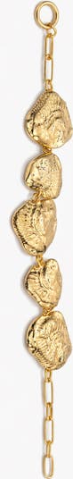 Matching the Oldeu shell necklace is this beautiful bracelet. Five bold shell charms are held by a large link, adjustable chain, allowing you to choose your own size and tension. Summer is never over with our Quora collection. Featuring destroyed shells, rough textures and brushed finishes, these rustic pieces are reminiscent of days under the golden sun. made to make statements, these pieces can be worn all year round.