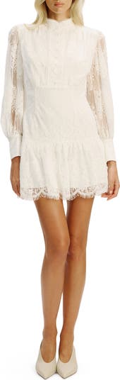 Delicate lace skims the silhouette of this drop-waist minidress, framed by sheer sleeves and made with scalloped edges that amp up the romance of your look.