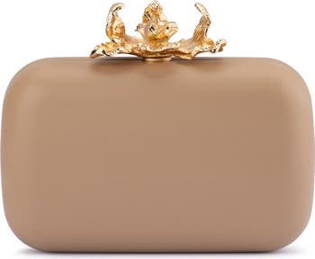A lustrous orchid clasp adds glamorous intrigue to an evening-ready clutch fitted with an optional chain strap for hands-free carry.
