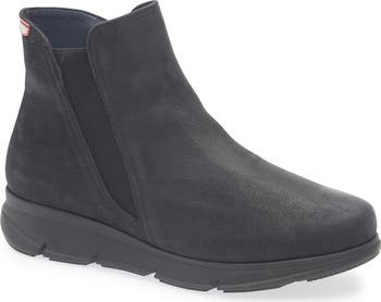 An inset elastic gore eases the fit of this comfort-minded bootie constructed from water-repellent leather and grounded by a durable grip sole.