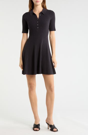 Allover ribbing and a kiss of stretch enhance the close-fit of this polo dress punctuated with a swingy flared skirt.
