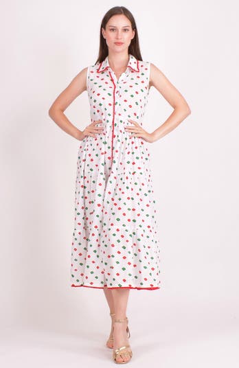 The Olinda Cotton Tiered Midi Dress is a white cotton midi piece adorned with playful red and green dots and finished with charming pom-pom detailing. Light, breathable, and effortlessly elegant, this tiered midi dress is perfect for daytime gatherings and summer festivities.