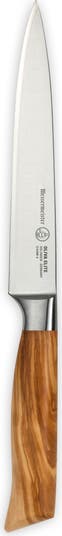 The Oliva Elite 6” Reverse Scalloped Utility Knife is the unsung hero of your kitchen drawer. With unique inverted serrations that grip and glide through food without tearing, it excels at slicing citrus, baguettes, charcuterie, and more. The fine edge at the tip adds precision, while the German stainless steel ensures lasting sharpness. Topped off with a smooth, sculpted olive wood handle, this knife turns daily prep into a moment of joy.
