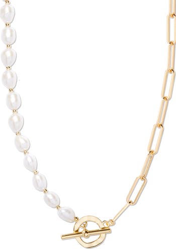 Complete your look with the modern allure of a distinctive necklace split between 14-karat gold-plated chain links and lustrous freshwater pearls.