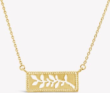 18k generously gold plated over sterling silver necklace with an olive branch motif inlaid on a rectangular medallion with beaded edge detail. The pendant is delicately set on an adjustable cable chain. Inspired by Isaiah 60:21. The Olive Branch Necklace reflects the natural grace, beauty and sacred maturation occurring when we abide in the One true vine. An artful representation of the spiritual growth we have when we give ourselves over to the Divine allowing His presence and will to guide, prune and produce fruits for His will. The Rooted collection delicately bridges the earthly and the celestial, evoking a serene allure of spiritual nourishment and eternal grace.