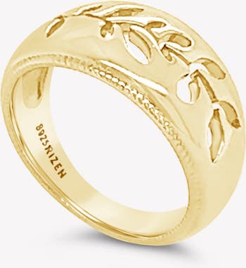 18k generously gold plated over sterling silver statement ring with an intricately cutout olive branch inlaid on a high polish dome shaped band with delicate roped edging. Inspired by Isaiah 60:21. The Olive Branch Ring reflects the natural grace, beauty and sacred maturation occurring when we abide in the One true vine. The Rooted collection delicately bridges the earthly and the celestial, evoking a serene allure of spiritual nourishment and eternal grace.