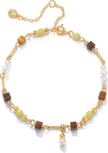Mixed-shape tiger's eye and onyx stones bring organic color to this delicate chain bracelet highlight with lustrous faux pearls.