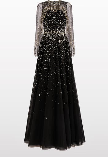 Radiating timeless sophistication, this gown features an illusion neckline and sheer sleeves adorned with delicate embellishment that cascades across the bodice and skirt. The softly flared silhouette and intricate detailing create an elegant sense of movement, making it ideal for formal events and evening occasions.