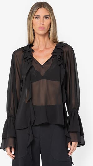 The Oliver Top is crafted in airy poly chiffon with a sheer, fluid drape. Designed with a soft V-neckline, delicate ruffle detailing along the front, and long sleeves finished with subtle flounced cuffs, it offers an elegant, relaxed silhouette. Lightweight and versatile, it layers effortlessly from day to night.