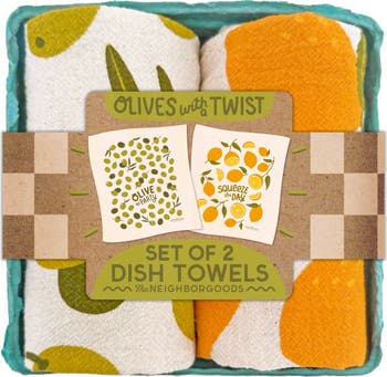 Brighten your kitchen with our Olives With A Twist Dish Towel Set, featuring two of our signature 100% cotton dish towels: Olives and Lemons. Bundled in a gift-ready, biodegradable produce container and topped with our sleek NEW branded belly band, this set is as cute as it is practical. Made from all natural, unbleached cotton and screen-printed with eco-friendly inks, these towels are soft, absorbent, machine washable, and gentle on the planet. They’ll add personality to any kitchen and bring you a smile. Perfect for holiday gifting, birthdays, housewarmings, and more! They also make adorable (and sustainable) gift wrap too.