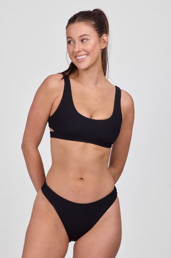 The JOLYN Olivia Bikini Bottom features a high waist, French cut, and slim-medium bum coverage with scrunched side details for a flexible fit that moves with you.