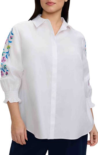 Vibrant floral embroidery enlivens the sleeves on this stretch-enhanced cotton-blend shirt fashioned with ruffled, smocked cuffs and a gracefully curved hem.