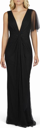 A deeply dipped neckline lends allure to this stunning floor-length gown with a net overlay that's asymmetric for a daring edge.