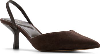 A V-cut topline and pointy toe bring crisp angles and dimension to a slingback leather pump featuring a dual-density foam footbed and sculptural heel.