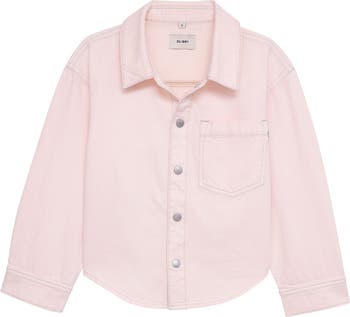 Olivia is a long sleeve shirt with a pointed collar and button front opening. Blossom is a light, bright pink hue. It features silver hardware, khaki stitching and clean finishing throughout.