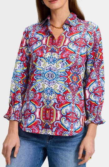 A delightful tile pattern romances this polished shirt framed by three-quarter sleeves with smocked cuffs.