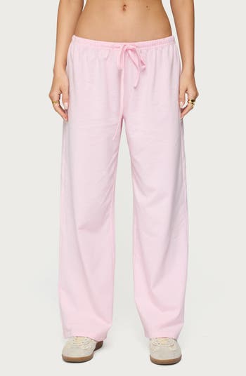 Pretty stripes and a drawstring closure add cozy vibes to low-rise, relaxed-fit pants cut from breathable stretch cotton.