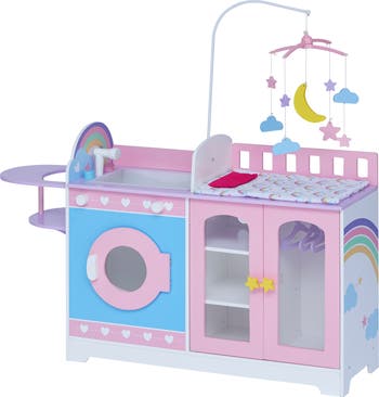 Kids will love taking care of their favorite doll with this changing station that comes with a built-in mobile, sink, high chair and washing machine.