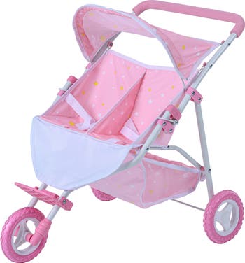 Little ones can bring their favorite toys along in this foldable stroller that has two seats.