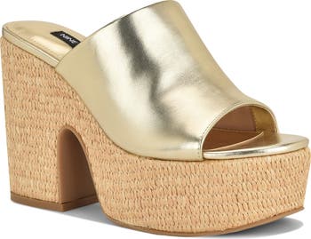 A raffia-wrapped platform and block heel bring a boho-cool aesthetic to a lofty slide sandal featuring a lustrous faux-leather upper for party-ready wear.