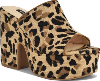 A lofty platform and soaring block heel bring retro-cool energy and height to a slide sandal patterned in an allover animal print for a fierce aesthetic.