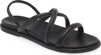 Tubular straps add modern appeal to a sleek leather sandal grounded by a cushioned footbed for lasting comfort.