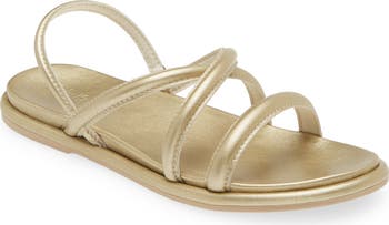 Tubular straps add modern appeal to a sleek leather sandal grounded by a cushioned footbed for lasting comfort.