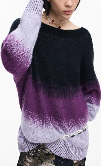 Bold gradient hues make a mesmerizing mark on this soft longline sweater framed by dropped shoulders for a relaxed fit.