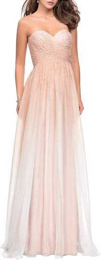 Stunning ombre chiffon dress that goes from a colored top to a white bottom. Bodice has criss cross pleating and is embellished with small iridescent stones. Back zipper closure.