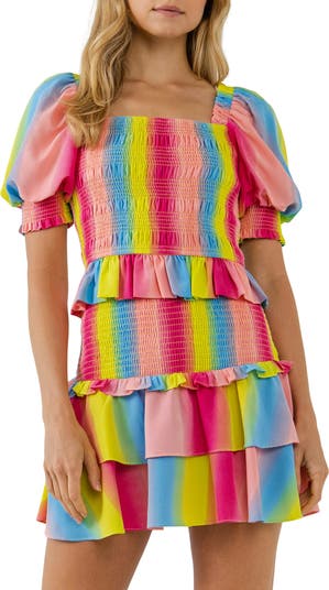 Bright sherbert hues stripe a playful puff-sleeve top with a smocked bodice and ruffles hem.
