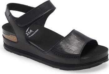 A leather-wrapped platform raises this sandal that offers total comfort with a contoured footbed that targets pressure points to relieve tension and stress.