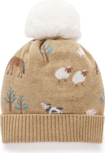 Our On the Farm Beanie is a fun accessory to keep your little ones head warm this winter. Featuring a sweet, farm animal jacquard design all over, fluffy pom pom on the top and ribbed turn back. Made from our cotton and wool blend for a cosy beanie. Available in 3 designs