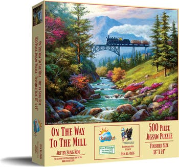 Immerse yourself in the tranquil charm of fall with the On the Way to the Mill 500 piece jigsaw puzzle by SunsOut Puzzles. Enjoy piecing together a breathtaking scene, painted by renowned artist Sung Kim that ushers in the timeless beauty of nature combined with the industrial elegance of a classic train. With a completion size of 18" x 24", it makes the perfect display for any setting. The satisfaction of perfectly interlocking pieces reflects SunsOut’s commitment to premium craftsmanship, durability, and offering a challenging yet enjoyable experience. Each piece is carefully cut from eco-friendly, recycled cardboard and printed with soy-based inks, reflecting a dedication to sustainability without compromising artistic appeal. As a proudly American, woman-owned small business, SunsOut is not only dedicated to superior craftsmanship and customer satisfaction but also supports the environment and eco-friendly practices. With exclusive licenses with top-tier artists, expect thoughtful construction, rich colors, and a worry-free guarantee for any missing or damaged pieces. The On the Way to the Mill puzzle is an invitation to escape into nature’s splendor and the nostalgic allure of a train journey, offering an adventure in every piece and a retreat into the serene world brilliantly illustrated by Sung Kim. Enhance your living space with the captivating, inspirational, and delightful On the Way to the Mill jigsaw puzzle today.