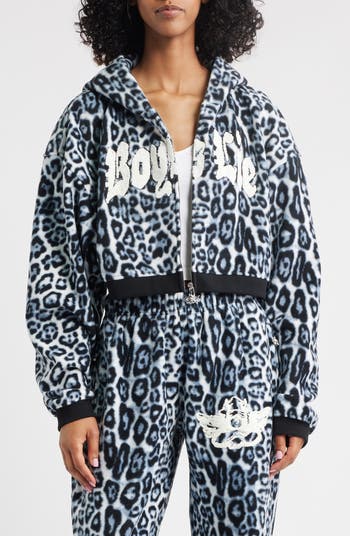Terry cloth graphics at the front and back bring big brand energy to this cropped cheetah hoodie sporting a logo-charm zipper pull.