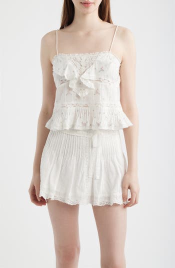 Delicate floral embroidery and thoughtful details lend romantic charm to this cotton camisole. Pintuck pleats and a soft ruffle cascading down the center front create graceful texture, while lace trim and slender straps enhance the nostalgic appeal.