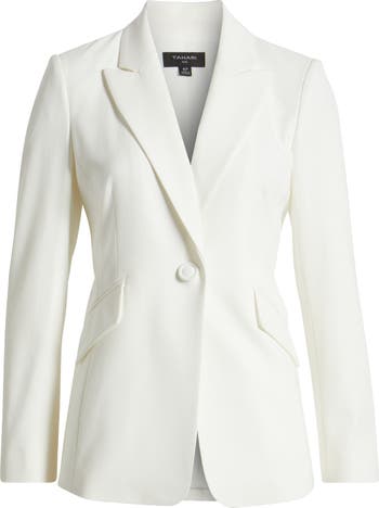 Peaked lapels and a covered button polish a desk-to-dinner blazer rendered in a summery, snowy shade.