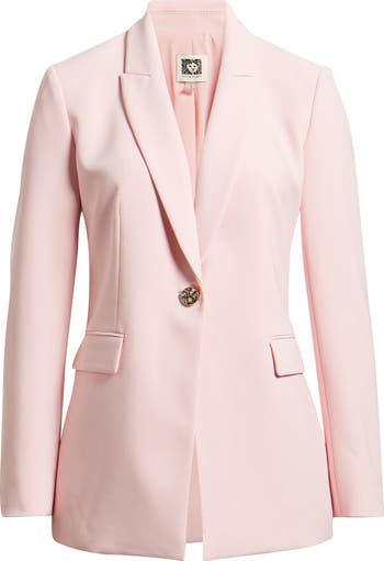 A single sculptural button adds subtle style points to a petal-pink jacket that will finish a workday look or elevate a weekend one.