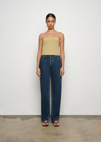 A tailored strapless bustier with curved bodice panel detailing in a mid-weight rayon blend suiting with subtle stretch.