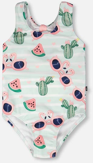 Playful and charming, this one-piece swimsuit in blue with flamingo and cactus print brightens summer days with its fun tropical design. The swimsuit features an allover flamingo, watermelon, and cactus print on pastel stripes, while the back is adorned with two pink bows, adding a girly touch. Crafted from recycled polyester with a hint of stretch, it offers comfort, style, and sun-ready fun.