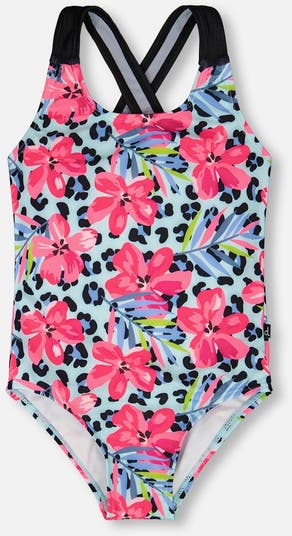 Dive into fun with this one-piece swimsuit with floral and leopard print, made to brighten every splash. This one-piece features a lively mix of tropical flowers and leopard spots, along with contrasting black crossed straps at the back for playful comfort and support. Crafted from recycled polyester with added stretch, it is both sustainable and flexible for all-day beach adventures.