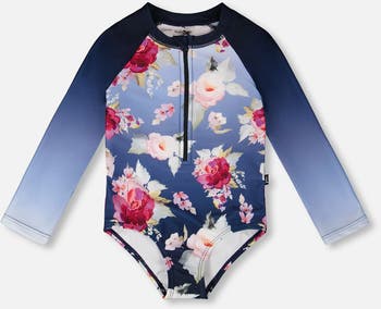 The one-piece long sleeve rashguard in blue with rose print blends elegance with sun protection. This swimsuit features a romantic rose print on the body, paired with gradient long sleeves and a practical front zipper for easy dressing. Made from recycled polyester with stretch, it offers comfort and UPF protection, a perfect choice from our “Like A Fish To Water” collection.