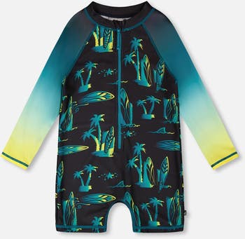 The baby and toddler one-piece long sleeve rashguard in black with surf print is designed for style and sun safety. This one-piece swimsuit features long sleeves and an allover surf-inspired print with boards and palm trees on a black background, crafted from recycled polyester with added stretch for comfort. A front zipper makes dressing simple while ensuring extra coverage for boys during long summer days by the water.