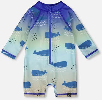 Our baby and toddler one-piece long sleeve rashguard in blue with whale print makes a splash in summer style. This one-piece swimsuit features long sleeves and a playful allover whale pattern in shades of blue, made from recycled polyester with added stretch for comfort and easy movement. A front zipper makes dressing simple while providing extra protection under the sun for boys and baby boys.