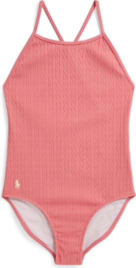 A cabled texture and intricate stitching add sophisticated detail to this one-piece swimsuit with thin, elastic shoulder straps for easy on and off without any clasps or buckles.