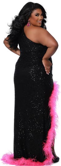 Pops of hot pink are all the rage! Not only does this fitted silhouette covered in black sequins show off your gorgeous shape, but design details take this look to new fashion heights! The high-low slit sequin dress features a one-shoulder neckline and ruched waist. Hot Pink ostrich feathers adorn the high slit and falls into the sweep train.