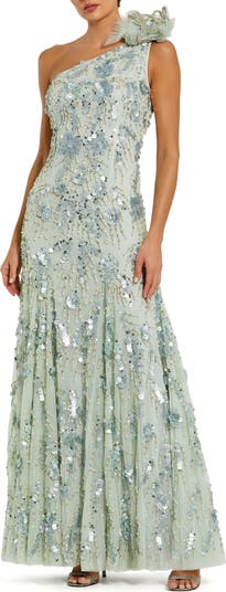 This stunning embellished mesh gown features an asymmetrical one-shoulder neckline, exaggerated flower detail, and jewel-encrusted embellishments, creating a glamorous, show-stopping look.