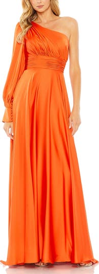 Embrace elegance in the One Shoulder Bishop Sleeve Flowy Gown, featuring a stunning one-shoulder design and billowing bishop sleeves for a romantic touch.