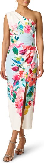 Soft pleats enhance the texture and dimension of this shoulder-showing gown romanced by vivid painterly blooms and accented with a leg-baring side slit for graceful movement.